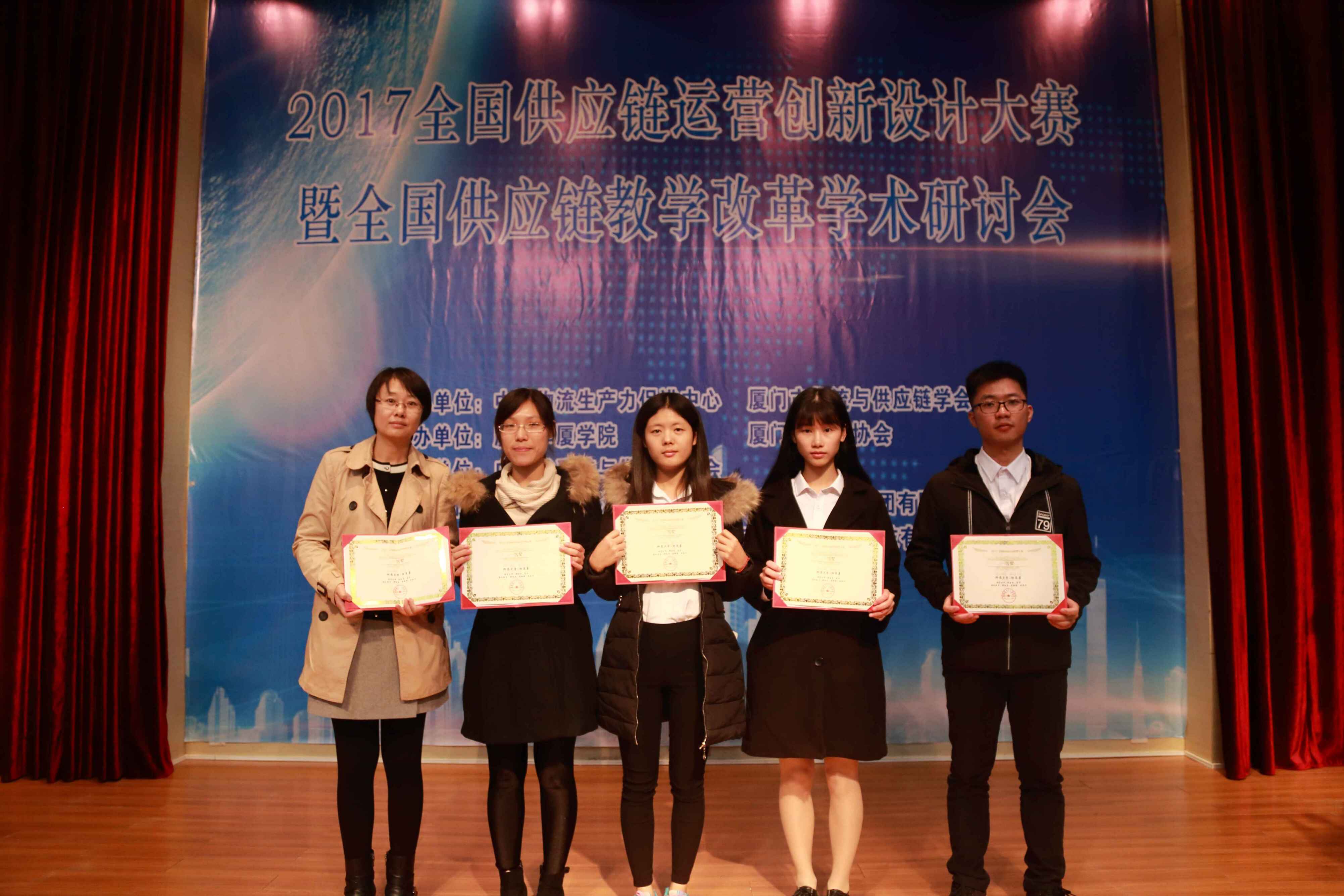 近日,由中国物流生产力促进中心、厦门市物流与供应链学会共同主办的2017全国供应链运营管理大赛在厦门市成功举办,pg娱乐官网由李征、郑雪清老师以及郑幼萍、曾丽娟、梁承洲同学组成的物流管理系独角兽团队从全国215所院校比赛队伍中脱颖而出,获得网赛一等奖。