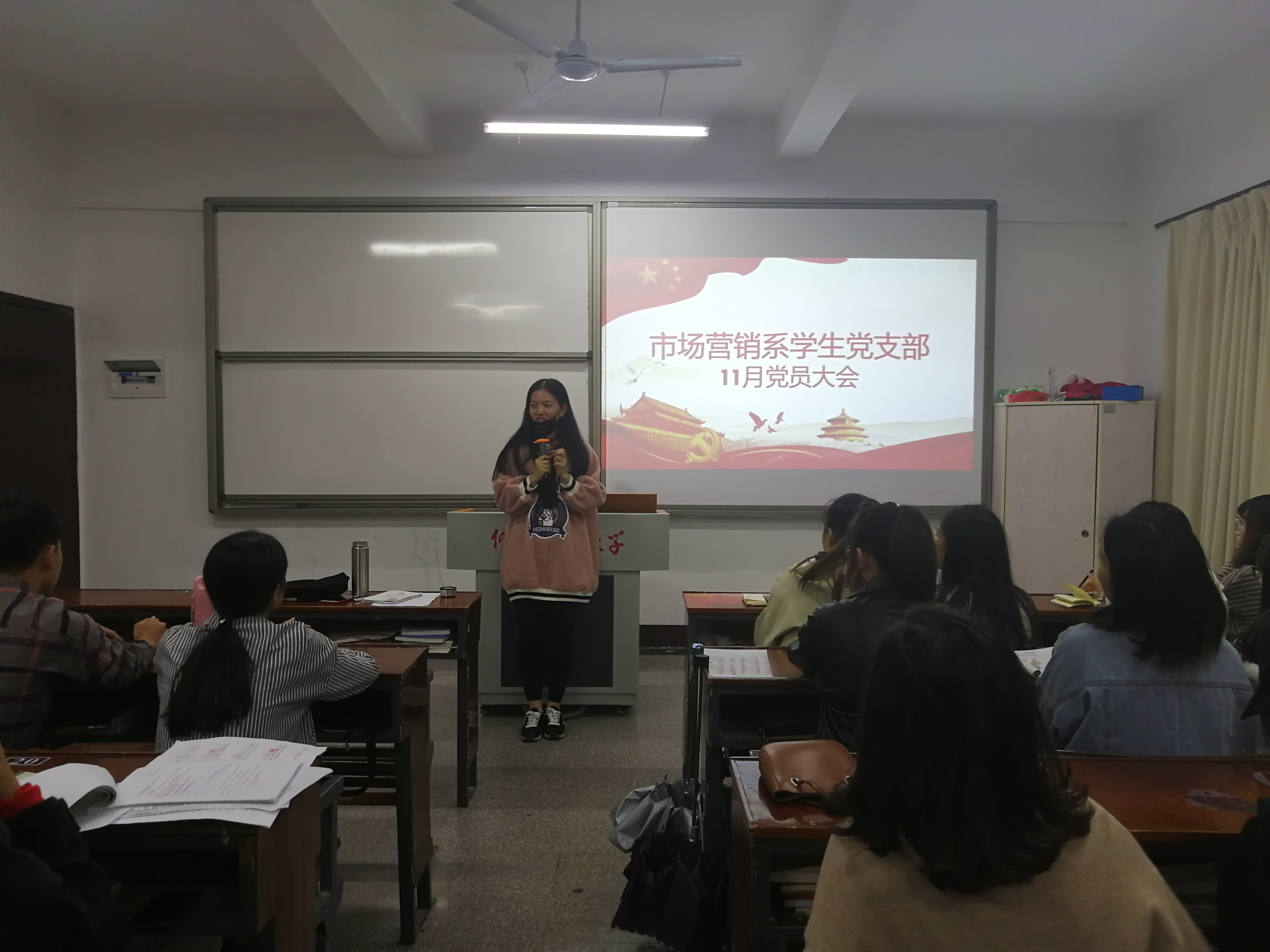 11月1日晚上,市场营销系学生党支部于共和楼411教室召开支部党员大会,参加大会的有市场营销系学生党支部全体党员以及2017级入党积极分子,会议由李陈蕊同志主持。
