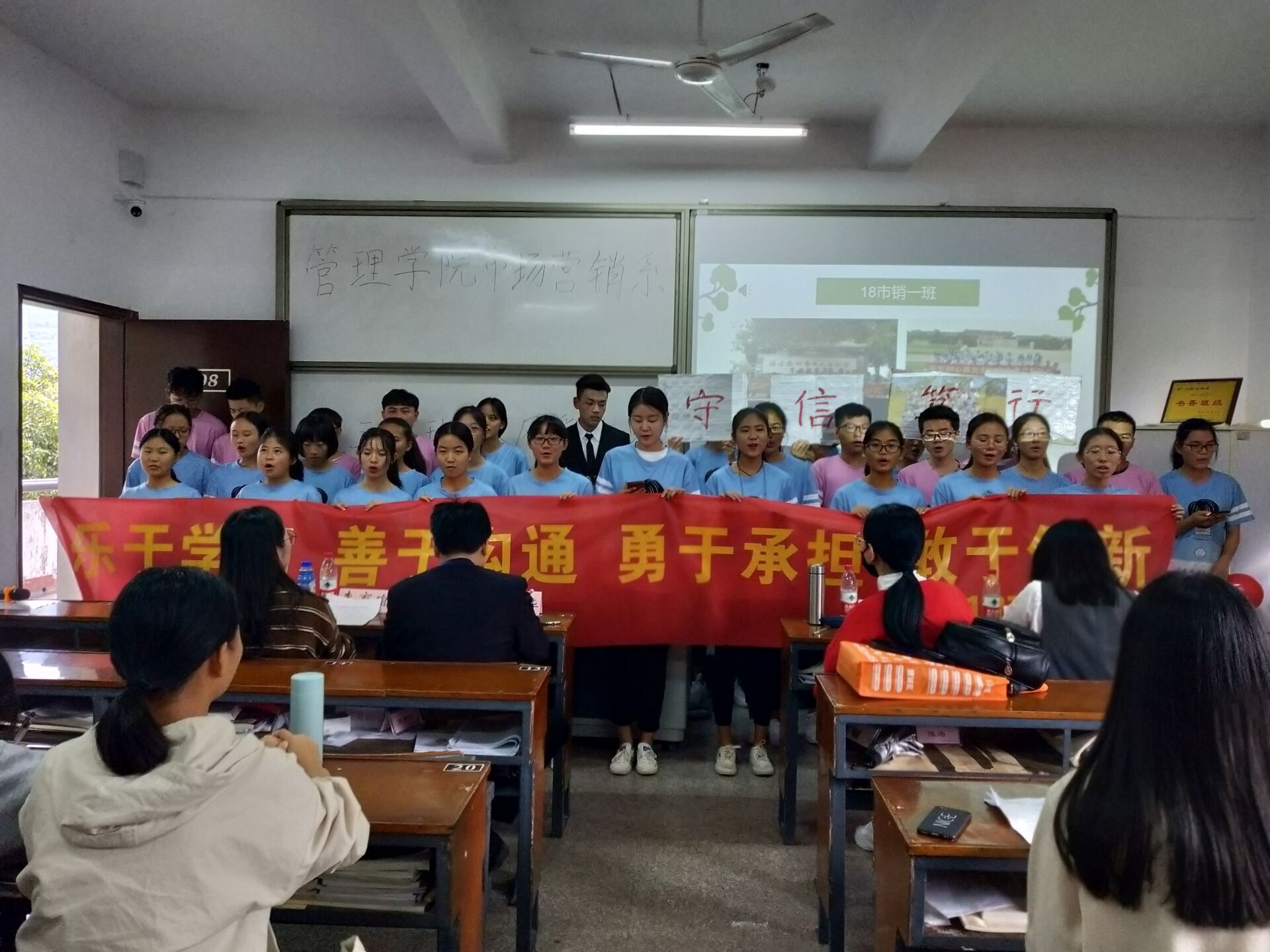 班级同学积极参与 本次比赛共有七支队伍参加,分别从学风状况、活动及成果、班级精神风貌等方面进行汇报。比赛过程中,各参赛班级通过精心准备、细心讲解及协调配合,出色地展示了团结向上的精神风貌。在创意展示环节中,独特的才艺展示及创意想法令人印象深刻。经过激烈的比拼,2017级市场营销1班和2016级市场营销2班从七支队伍中脱颖而出,进入院级复赛。