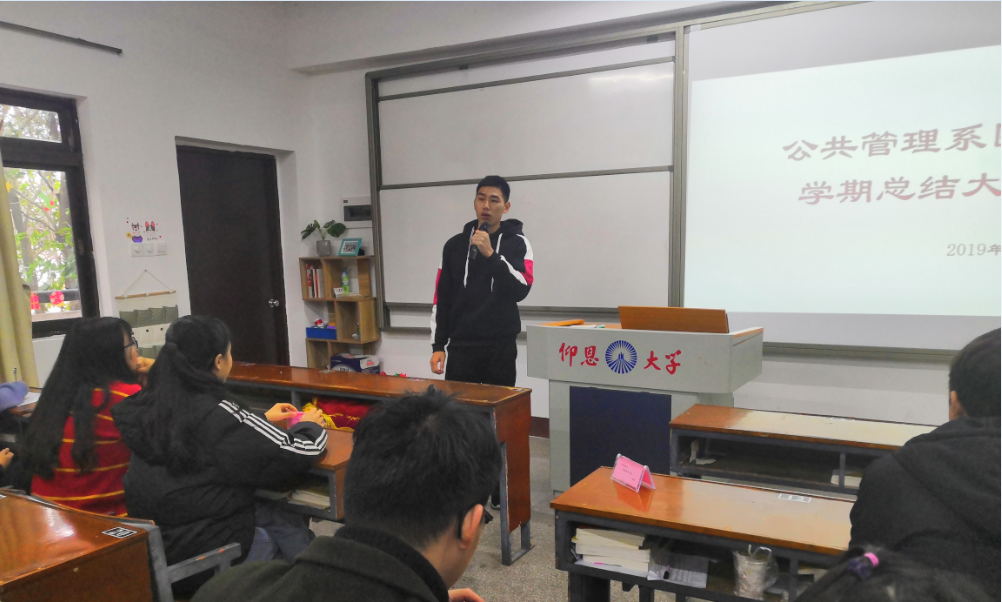 总结大会现场 在本学期团学工作即将结束的时候,为了推动团学工作更好更强更长久的发展,保证团学在新旧成员交接后能够更快的正常运转,公共管理系特意召开本次总结大会。会议由公共管理系学生会主席主持。首先,学生会主席对本学期各个部门工作取得的成绩进行了表扬,也从中指出不足需要加强的地方。然后,对新一年的团学工作作了部署与展望,同时使各部门明确今后的工作方向,为新学期工作的顺利开展打下基础。最后,辅导员徐鸿飞提出了2019年的工作计划,并对新一年的团学工作提出了更高的要求和期望。