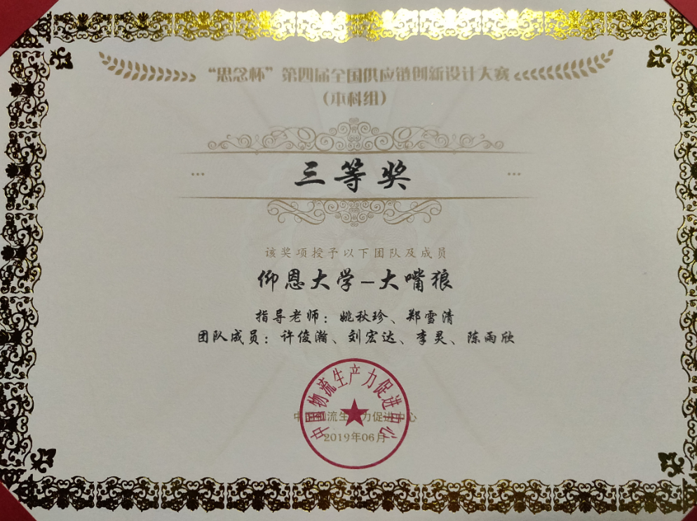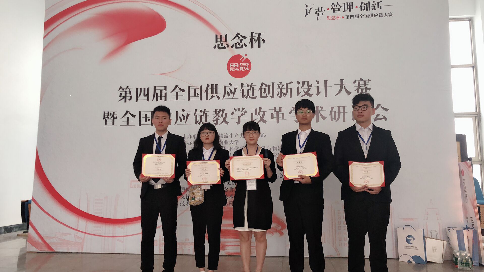近日,由中国物流生产力促进中心主办,青岛农业大学、中国管理科学学会供应链与物流管理专业委员会承办的“思念杯”第四届全国供应链创新设计大赛在青岛落下帷幕。pg娱乐官网许俊瀚、刘宏达、李灵、陈雨欣4名学生组成的“大嘴狼队”在姚秋珍和郑雪清两位老师的带领和指导下,经过半年时间的不断练习、操作、探索,一路过关斩将,在全国总决赛中发挥出色,荣获本科组三等奖。
