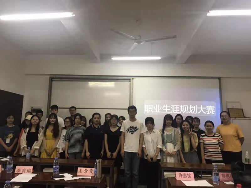 合照 比赛围绕大学生职业生涯规划展开,6位参赛者从自我认知、职业环境分析、职业目标确定、评估与调整几个方面讲解自己的职业规划。最后许惠铭老师从选手演讲、仪容仪表、PPT讲述三个不同方面对选手们的表现进行了点评,他认为选手自我评估比较全面,职业目标也相对清晰,同时指出选手们在规划中的不足之处,并希望选手们在规划时,要坚定信念,志存高远。