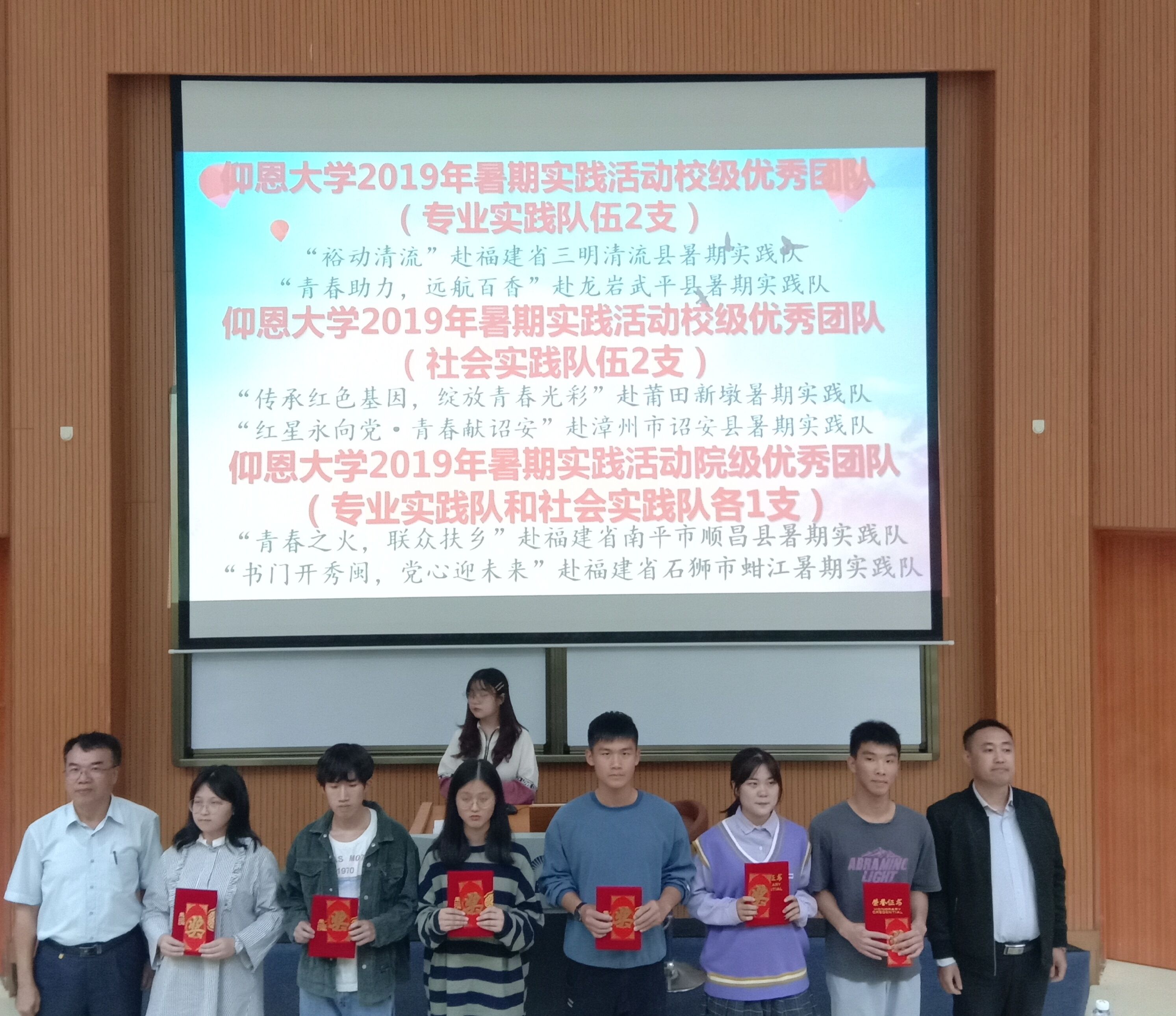 表彰大会现场 “裕动清流”赴福建省三明清流县暑期实践队、“青春助力,远航百香”赴龙岩武平县暑期实践队、“传承红色基因,绽放青春光彩”赴莆田新墩暑期实践队、“红星永向党·青春献诏安”赴漳州市诏安县暑期实践队等4支校级优秀团队学生代表通过PPT、短视频、实物展示等方式,为全体大一新生作经验分享,畅谈实践中的见闻与心得、成果与收获。
