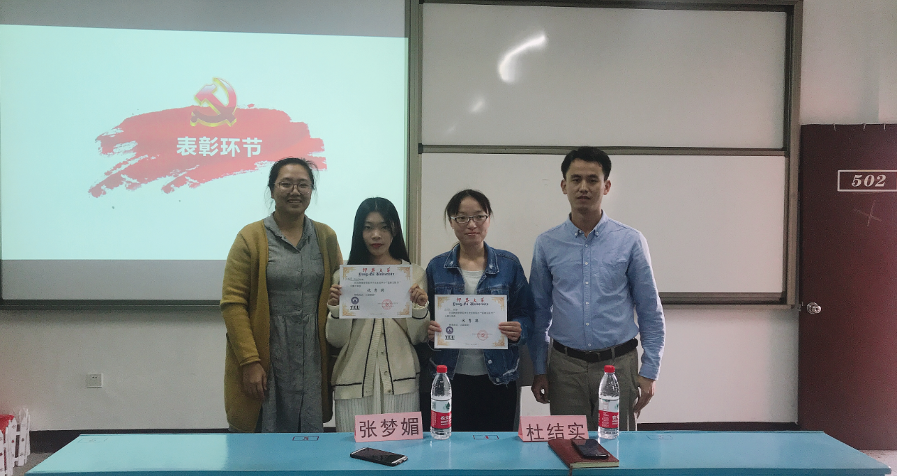 颁奖环节 表彰大会伊始,大家通过PPT浏览了每个参赛选手的作品并发表自己的感言,对比获奖者作品找出自己作品的不足之处。随后,主持人宣布最终获奖名单。张琳、黄露莹、郑伊玲同学获得此次比赛的优秀奖,李丹妮、张文静、晏美静同学获得三等奖,林欣月、蔡鸿婷同学获得二等奖,戴慧楠同学夺得本次比赛的冠军。每位获奖选手依次上台由杜结实老师和张梦媚老师为其颁奖并合影留念。同时,获得本次一二等奖的同学上台分享自己的创作经验,与大家一起学习进步。