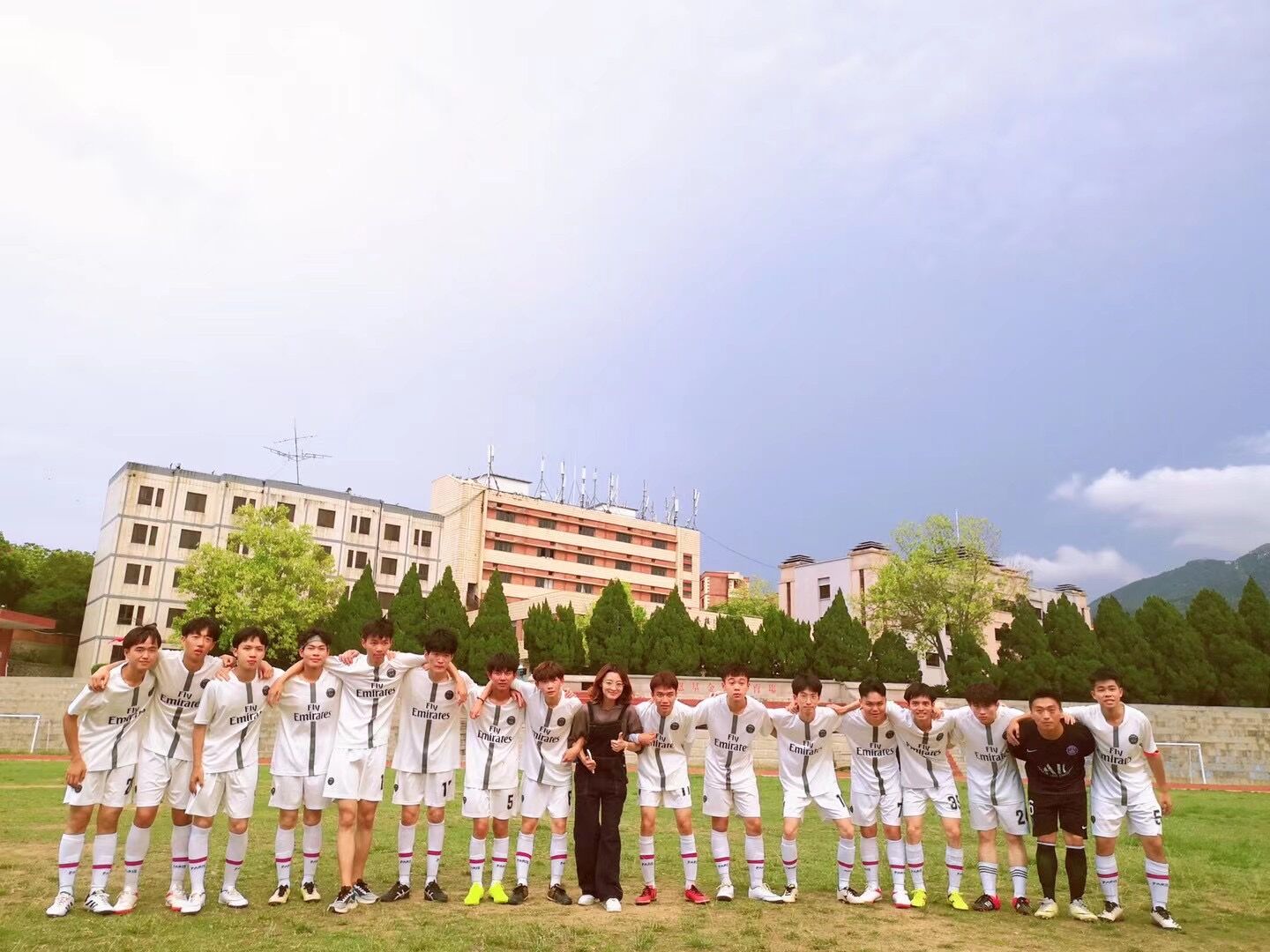 全体合照 裁判哨声响起,运动员们迅速进入状态,你争我夺,你攻我守。场上巧妙的传球,华丽的转身,完美的动作,默契的配合,赢得了啦啦队们的阵阵欢呼声。尽管天气炎热,但球员们个个激情澎湃,在赛场上挥洒汗水,展现自我。整场比赛打的十分火热,双方的攻势此起彼伏,随着场上的形式越来越焦灼,进攻越来越猛烈,场上的观众也逐渐多了起来,大家连声叫好,紧张的气氛一直环绕在球场上。经过了一个多小时的激烈比拼,最终,恭喜我系足球赛事喜进八强。