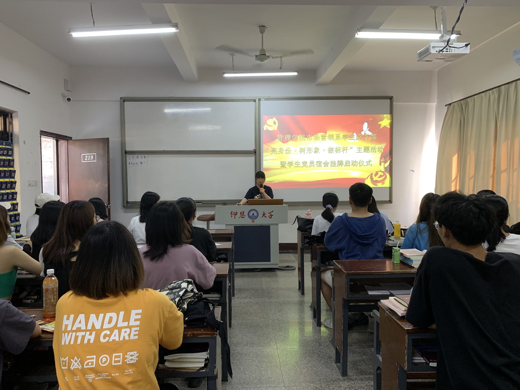 为进一步促进学院宿舍文化建设,发挥学生党员示范和榜样引领,6月17日下午,pg娱乐电子游戏官网入口市场营销系学生党支部在共和楼219开展“亮身份、树形象、做标杆”主题活动暨学生党员宿舍挂牌启动仪式。仪式由学生党员代表余凤凡主持。