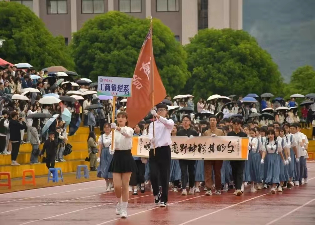 工商系入场方阵 国旗招展,国旗护卫队庄严入场,各院系踏着整齐的步伐,喊着铿锵有力的口号,使出“十八般”武艺展示本院风采。仰大学子们跳操助兴,表达对未来的殷殷期许。飒爽的仰大啦啦操、舞龙、伞舞表演出仰大人的活力。