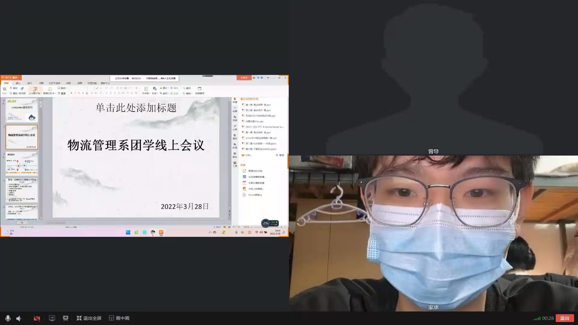 3月28日上午,线上召开物流管理系团学组织工作会议。本次会议主要内容为:针对近期物流系团学开展的活动进行梳理,并强调了相关事项。曾上洪老师强调,疫情期间,团学应扛起疫情防控的大旗,以身作则,在做好防疫工作的同时深入物流系学生群体,及时关注和帮助需要帮助的同学,以实际行动践行抗疫责任,团结一心,共克时艰。