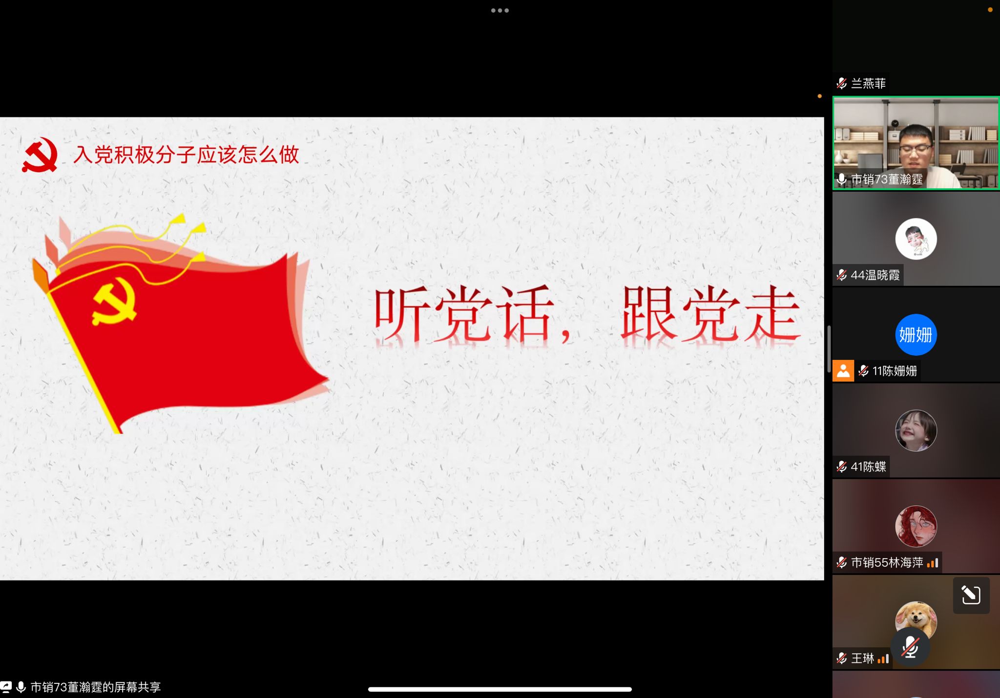 4月13日下午,市场营销系学生党支部于腾讯会议开展入党积极分子讨论会。本次讨论会由温晓霞同志主持,支部书记连景霞、党员兰燕菲和吴昭英,以及46期入党积极分子参加。