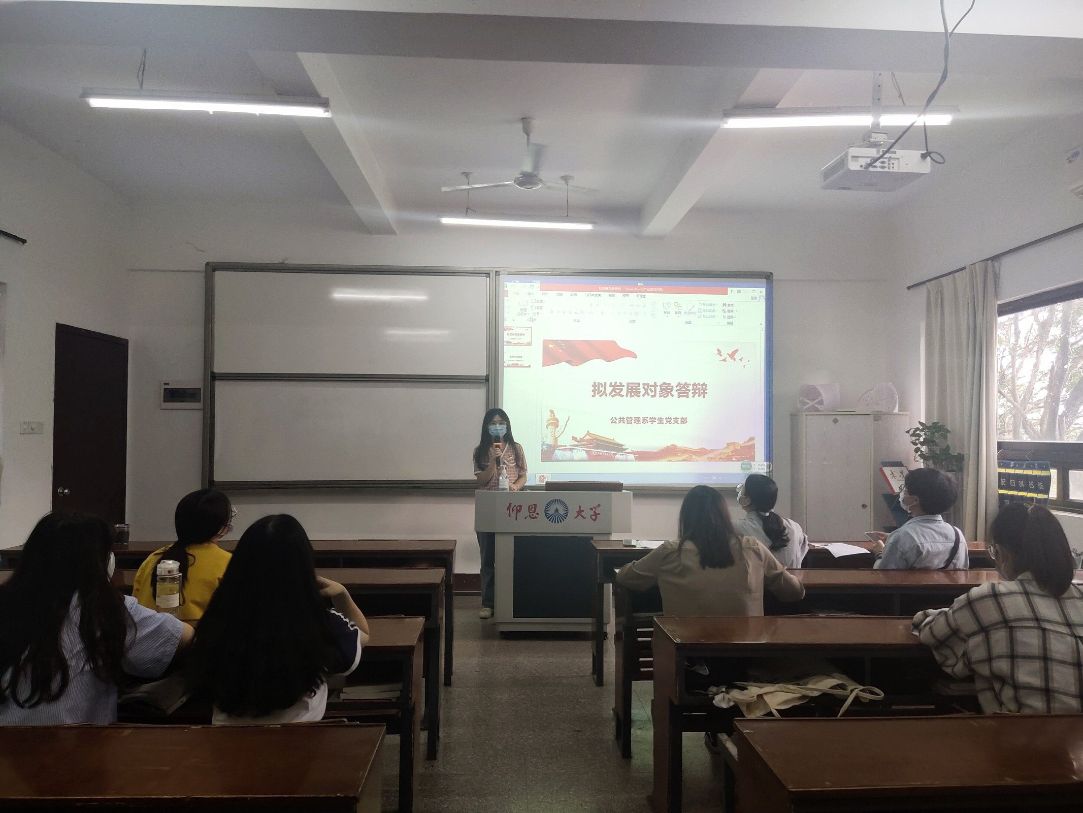 为了严格把控党员发展关,深入细致审查拟发展对象的入党动机、理论素养和政治觉悟等,保证党员发展质量,更好地发挥党员先锋模范作用,公共管理系学生党支部于4月28日在共和楼216教室开展“拟发展对象”答辩会。本次答辩会由公共管理系学生党支部书记叶丽香、pg娱乐电子游戏官网入口党总支宣传委员洪晓徽、支部支委及16名拟发展对象参加。