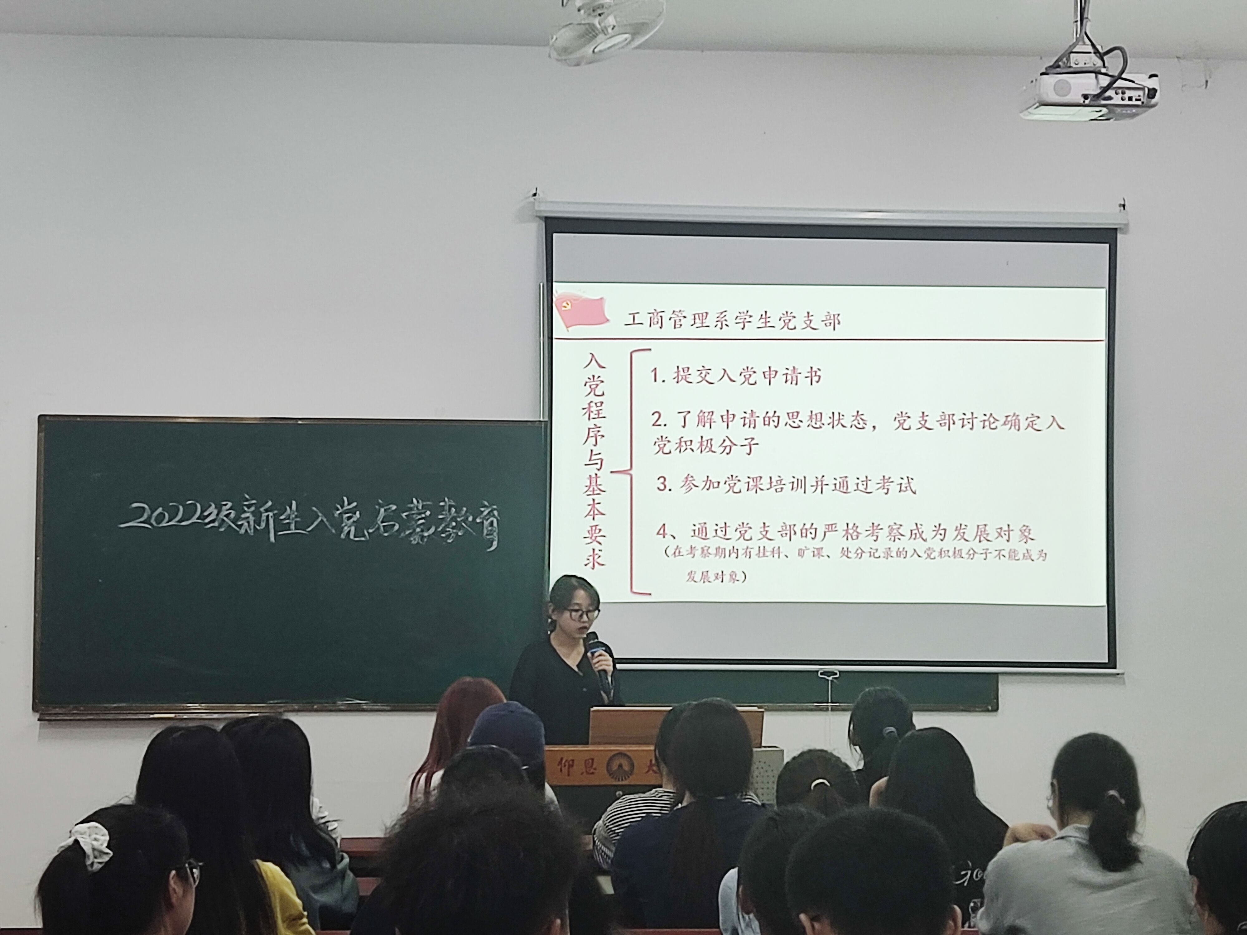 学生党员上台讲解 会议上,陈俊霖、张建华、马慧林、陈鸿、陈锦隆五位学生党员通过PPT形式,分别从中国共产党的重要性、党员要求、入党流程和如何书写入党申请书、思想汇报等方面进行了详细的介绍。让新生们正确认识到了入党对自身的益处,深入了解了党的基本知识,树立了正确的入党动机。最后,四位学生党员强调了入党是条不平坦的道路,需要坚定的信念、坚强的意志、信心和勇气,关键靠我们自身的不断努力。