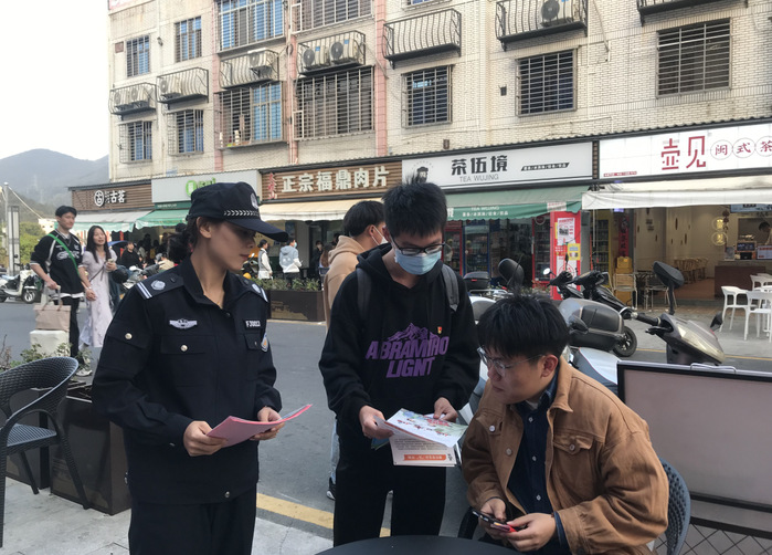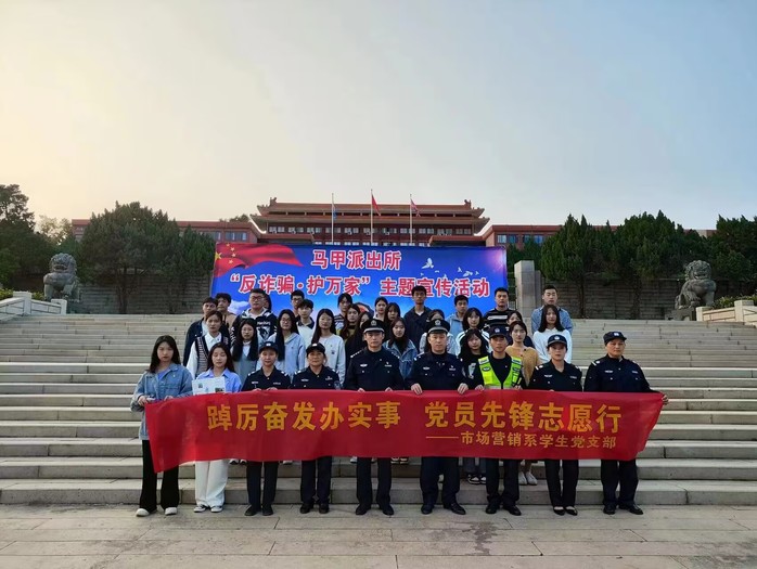第二组党员同志们和民警进入学生街,向附近同学们详细介绍了当前电信网络诈骗犯罪的主要特点、常见种类、新型手段和危害后果等基本常识。通过讲解诈骗案件常见作案手段和骗术,向同学们普及防范电信网络诈骗知识,提醒同学们在日常生活学习中,增强自我防范意识,不轻信陌生短信、电话,不轻易向陌生人进行转账。
