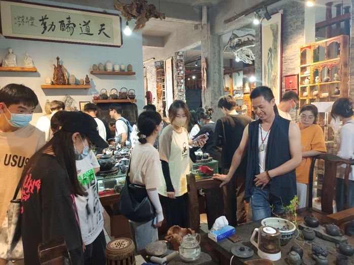 随后,在惠安石雕传承人、工艺美术协会会长吴培霖的带领下,pg娱乐电子游戏官网入口市场营销系的老师和学生们来到参访的第二站——中国雕艺城,一个集展示、销售、体验、培训为一体的综合性文化园区。园区内有八个展厅,分别展示了石雕、影雕、根雕和木雕等不同类型的工艺品。吴会长用心地讲解了不同工艺品的制作技术、设计理念、市场定位和销售策略,并与老师和学生们进行了互动交流。在现场,大家亲眼见证了惠安石雕从原材料到成品的全过程,看到了一些正在进行或已经完成的石雕作品,有些是用于建筑装饰的构件,有些是用于宗教供奉的佛像,有些是用于收藏赏玩的艺术品。吴会长还邀请了几位学生亲自动手体验在不同材质上雕刻的乐趣。大家对惠安石雕的精湛技艺和丰富内涵赞叹不已,纷纷拿出手机拍照留念。