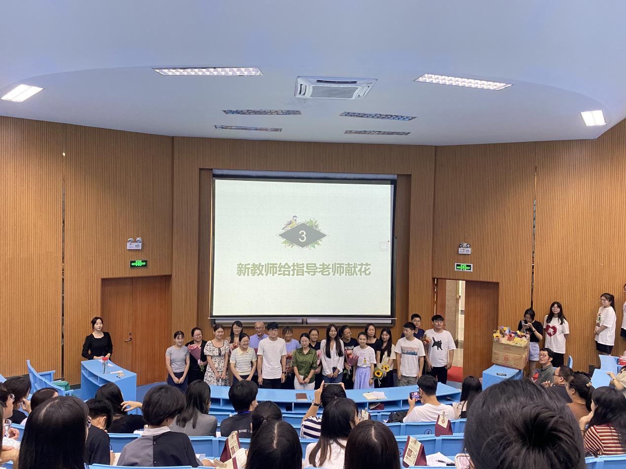 在献花环节中,学院学生代表向教师代表送上鲜花,表达对老师们辛勤培养的感谢与感恩之情,学院10名新入职教师也向各自导师献上鲜花并行鞠躬礼,表达对导师培养的感谢,增强了导师们的责任感与使命感。黄益坚老师从导师角度分享了他对年轻教师躬耕教坛的建议,新入职教师李崇伟表达投身教育,强国有我的青春理想。