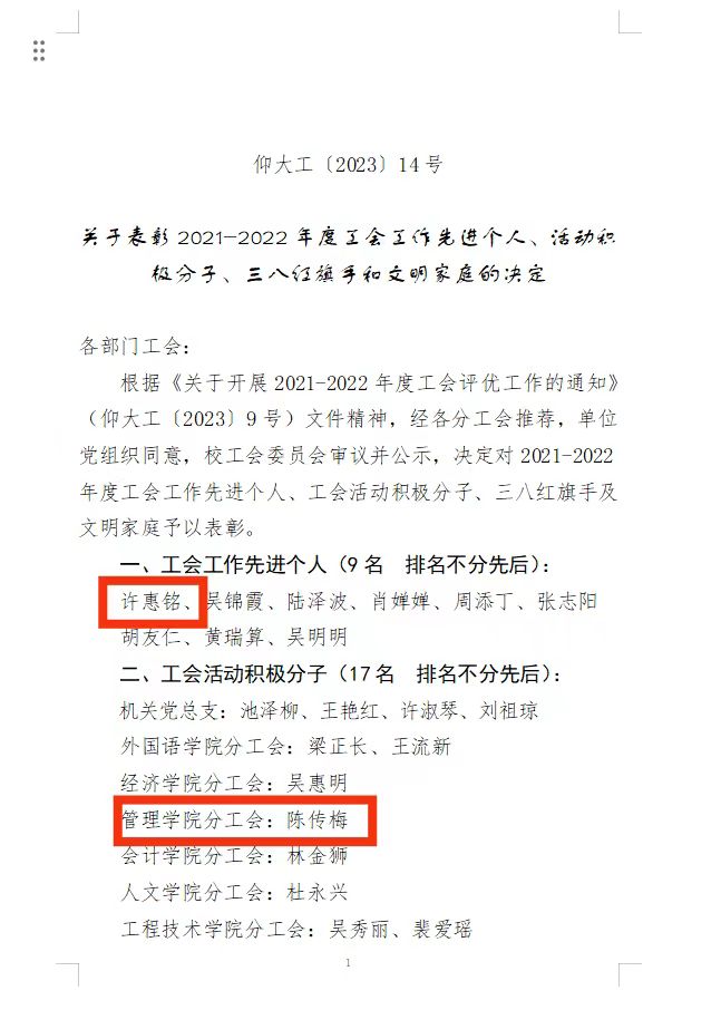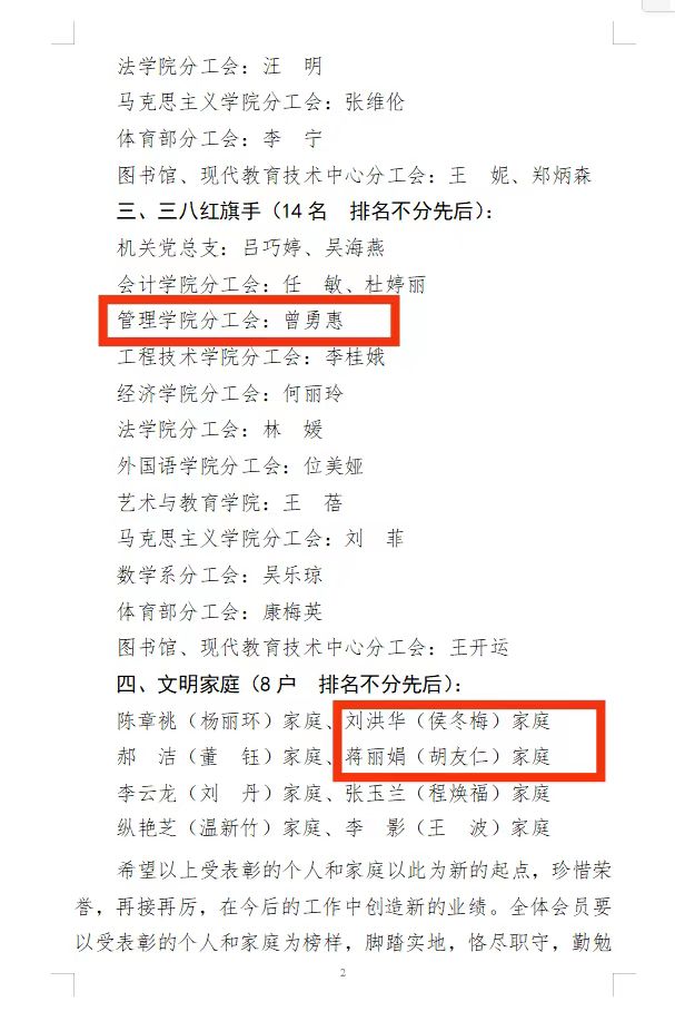 9月8日,校工会对过去一年在工会工作中做出突出贡献的教职工进行了表彰,pg娱乐官网许惠铭老师获工会工作先进个人、陈传梅老师获工会活动积极分子、曾勇惠老师获三八红旗手、刘洪华(侯冬梅)家庭、蒋丽娟(胡友仁)家庭获文明家庭荣誉称号。获表彰的老师们表示,他们将以此为新的起点,珍惜荣誉,再接再厉,在今后的工作中创造新的业绩!