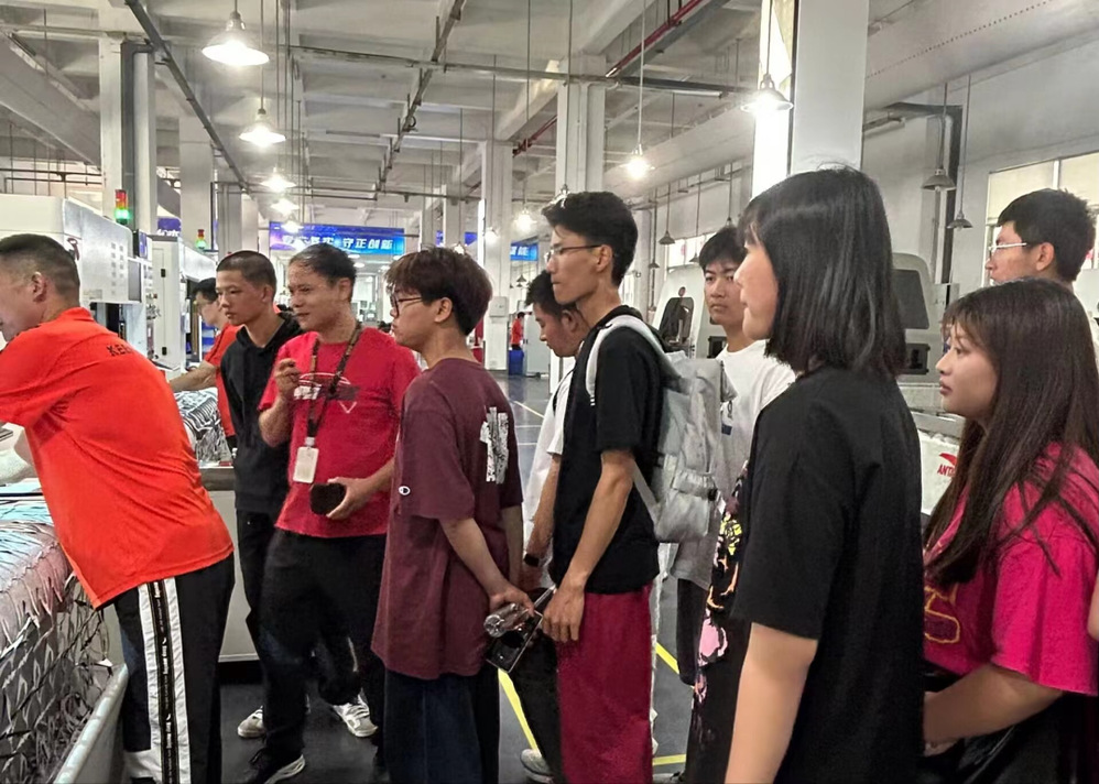 在晋江鞋业第二事业部智能制造车间,一台台自动化集成裁断设备有条不紊地运转着,工人们站在设备前不时地巡检,拿取、整理冲裁完成的鞋类配件,同学们感受着数字化、智能化与科技创新所带来的发展与变化。在针车车间,同学们近距离观看了运动鞋生产的整个流程,感受着“一针一线”反复锤炼的工匠精神。