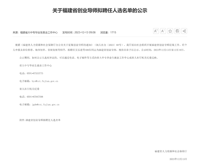 据悉,福建省创业导师评聘工作由福建省人力资源和社会保障厅负责,三年一聘期,迄今已经聘任两轮。本次是第三轮评聘,面向全省聘任新一批创业导师,旨在为进一步加强创业导师队伍建设,充实完善福建省创业导师库。本次获选的人员是来自全省各地企业、大中专院校、创业培训机构、创业贷款担保机构、创业服务机构、创业孵化机构、行业协会及其他相关单位的优秀创业导师,他们经验丰富、业务扎实,将更好地为广大创业人员提供咨询、指导服务。