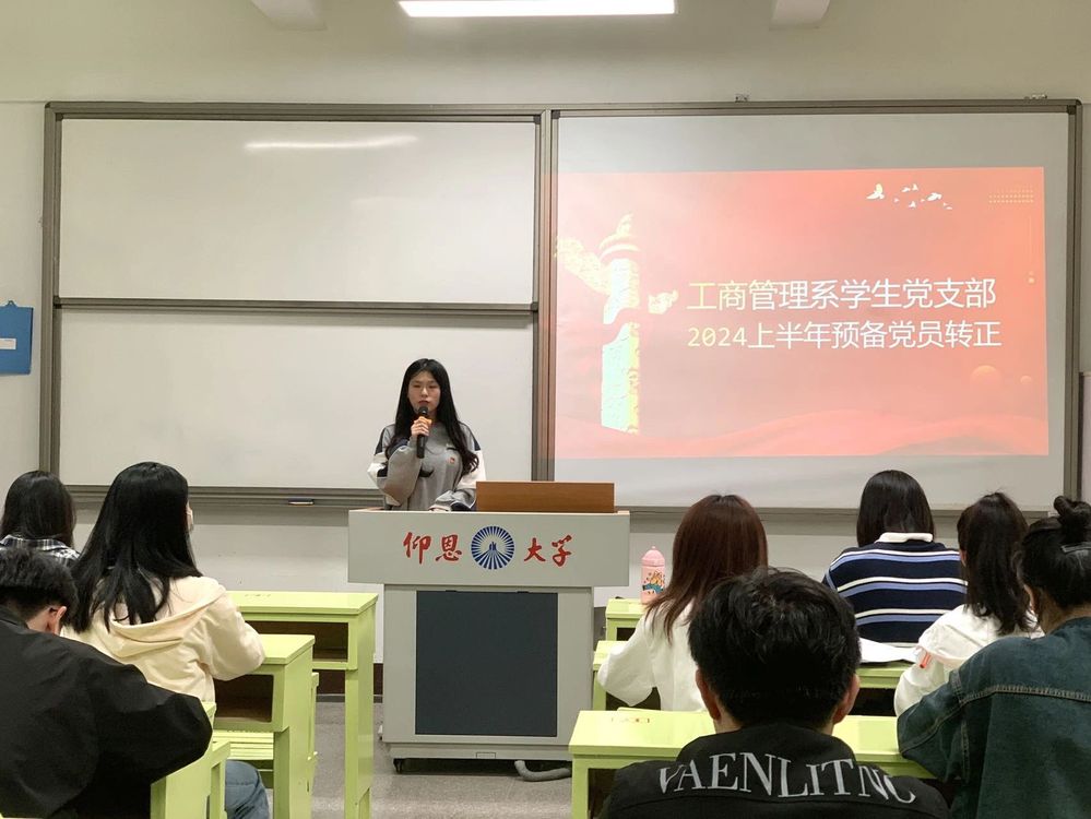 2024年04月10日,工商管理系学生党支部于共和楼303室召开预备党员转正大会,本次会议由工商管理系学生党支部滕睿思同志主持开展,支部全体成员参加本次会议。