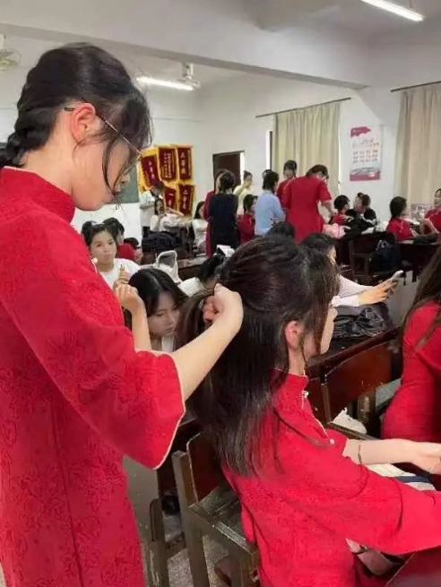 在活动的过程中,志愿者们认真细致、一丝不苟,非常用心地对待每一位参赛人员,为他们化上适合舞台表演的妆容。整个化妆的过程行云流水,各位志愿者辅助配合,从你来打底-定妆,我来画眉-修容,她来发型-头饰。最终完成了为参赛人员化妆的志愿活动。