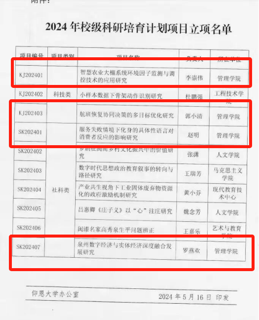 近日,经学校学术委员会评审,pg娱乐官网四位教师喜获2024年校级科研培育计划项目立项,其中科技类项目2项、社科类项目2项,具体情况如下: