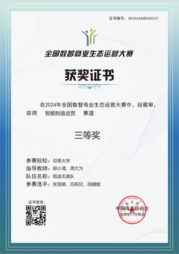 pg娱乐官网共4支队伍报名参加智能制造赛道,本次比赛历经近一个月的练习赛,每场练习赛4支队伍都认真准备。练习赛前,他们积极制定计划、联系合作伙伴,练习赛后,他们认真复盘、总结。通过初赛的激烈竞争,4支队伍最终获得二等奖、三等奖的佳绩。其中,由2021级工业工程专业的丁晓松、陈佳荣和2022级物流管理专业的蔡静涵同学组成的“电磁场队”荣获国家级初赛二等奖;由2022级工业工程专业的吕宁萍和2022级物流管理专业的张雪莹、施盈珊同学组成的“智能小纵队”荣获国家级初赛二等奖; 由2021级工业工程专业的施荣炮、姚建军和2023级工业工程专业的王博同学组成的“CrazyHeart队”荣获国家级初赛三等奖; 由2022级工业工程专业的张慧娜、吕莉欣和胡捷敏同学组成的“钱途无量队”荣获国家级初赛三等奖。