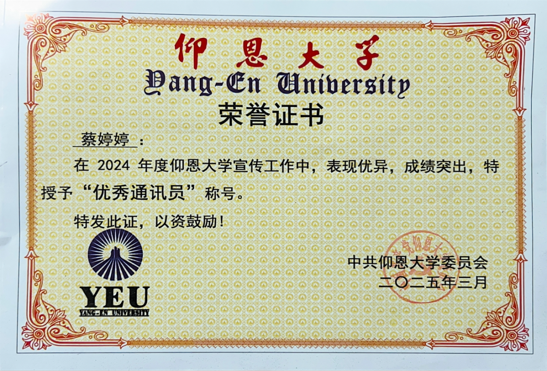 图2 pg娱乐电子游戏官网入口蔡婷婷老师获“优秀通讯员”称号