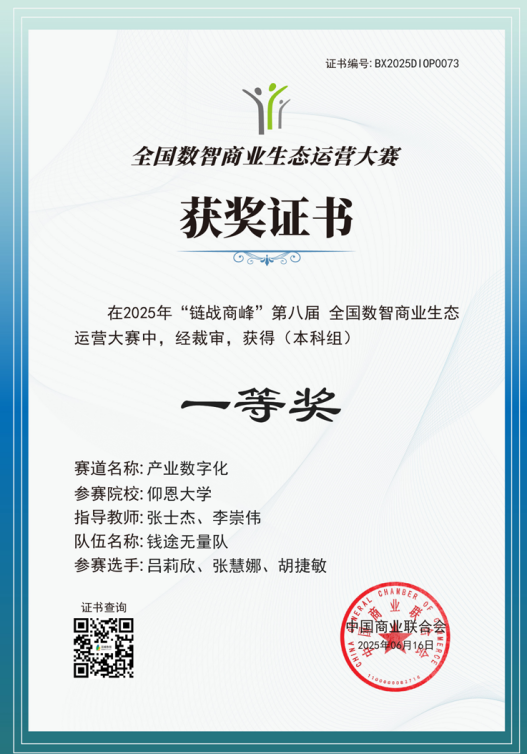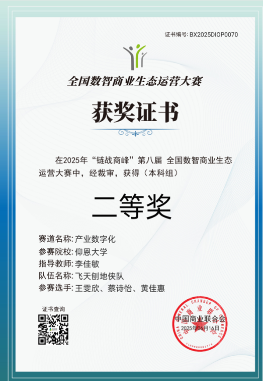 近日,第八届“链战商峰”全国数智商业生态运营大赛决赛圆满收官。本次大赛由中国商业联合会主办,上海百蝶教育科技有限公司提供技术支持,以“数智赋能商业,生态引领未来”为主题,吸引了来自31个省、自治区、直辖市434所院校的997支队伍踊跃参与,竞争异常激烈。最终,pg娱乐官网学子表现出色,在众多参赛队伍中脱颖而出,由张士杰和李崇伟老师指导的参赛队伍(成员为2022级工业工程吕莉欣、张慧娜、胡捷敏)以初赛和决赛均第一的成绩斩获了本科组产业数字化赛道团队国赛一等奖,由李佳敏老师指导的参赛队伍(成员为2022级市场营销王雯欣、蔡诗怡、黄佳惠)斩获了国赛决赛本科组产业数字化赛道团队二等奖的优异成绩。