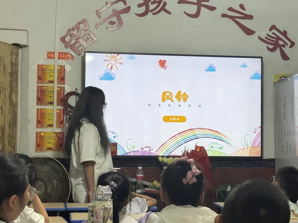 蛋托变风铃,环保润童心。实践队队员孙睿涵由狐狸先生的故事引入手工鸡蛋托风铃,传递环保理念。小朋友们用画笔在鸡蛋托上认真绘图,绘图完成后,孩子们在队员的帮助下,将鸡蛋托小心串连成一个个风铃。小朋友们在卡片上郑重写下自己的愿望和祝福,挂在风铃上。