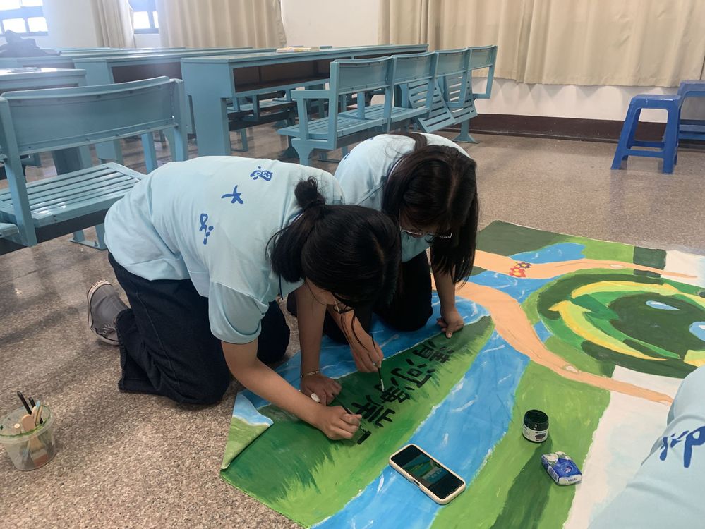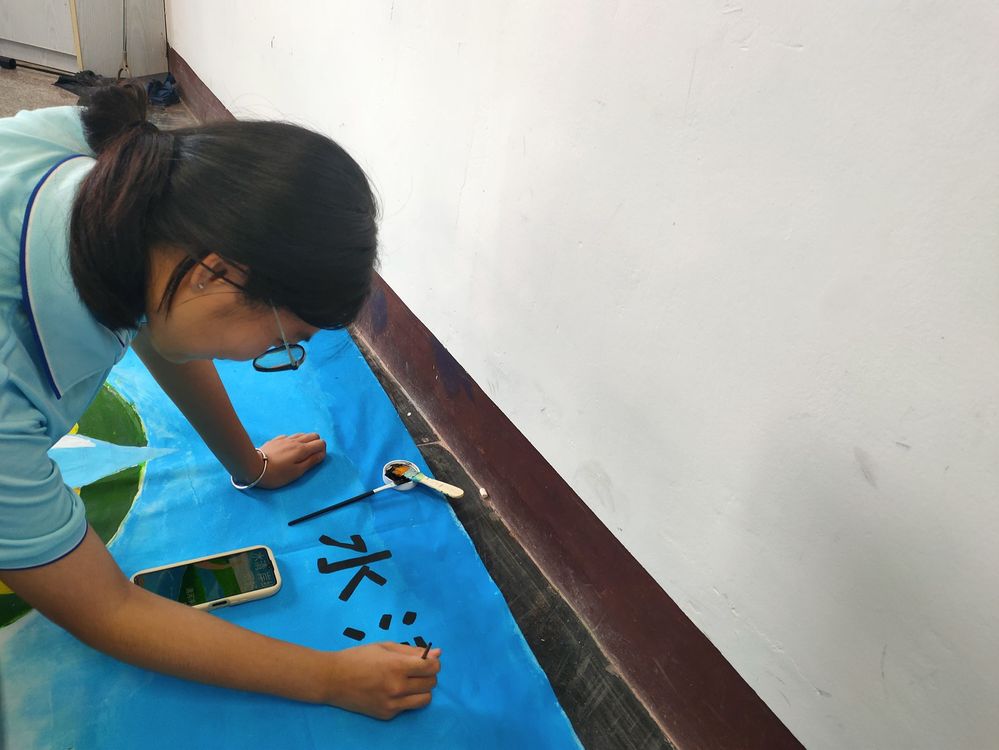 【实践】实践队员把画布挂在河长制主题公园的墙上
