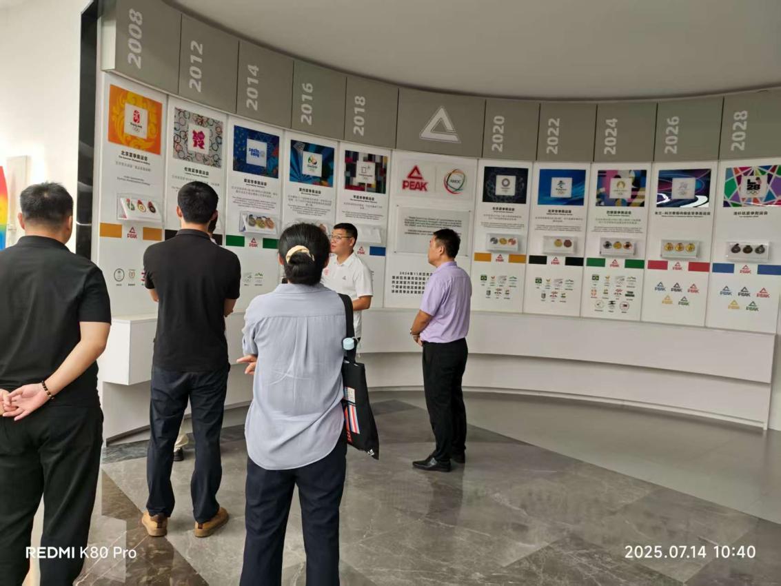 在企业代表的带领下,考察组首先来到匹克国际中心的品牌馆。该区域总面积达1500平方米,讲解员罗书明详细介绍了匹克的品牌发展历程、核心技术产品以及全球化布局的成果。馆内配备了先进的运动产品检测设备、3D设计软件系统及多媒体教学设备,能同时容纳50名学生开展实习活动,完全满足不同专业实习教学的空间与设备需求。考察组一行还实地查看了鞋业生产线,在讲解员连清彬的细致介绍下,深入了解了生产流水线的运作流程,直观感受了企业的生产制造环节。