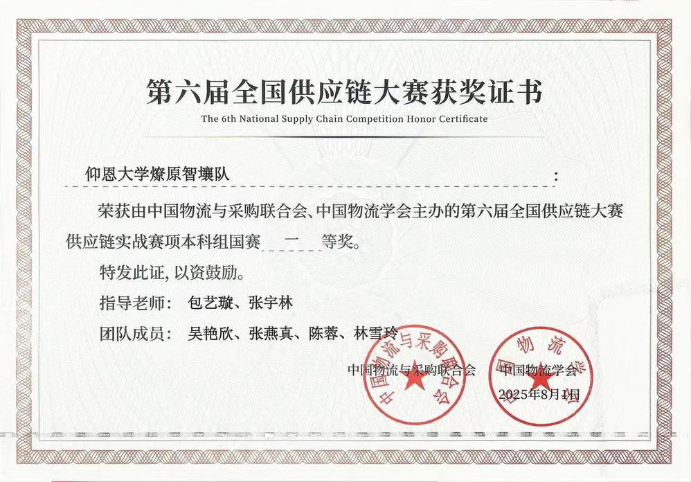 2025年8月1日,由中国物流与采购联合会、中国物流学会主办的第六届全国供应链大赛供应链实战赛项全国总决赛在广西南宁圆满落幕。经过激烈角逐,由管理学院包艺璇、张宇林老师指导,物流管理系吴艳欣、张燕真、陈蓉与林雪玲组成的pg娱乐电子游戏官网入口燎原智壤队在全国本科组总决赛中荣获大赛一等奖。