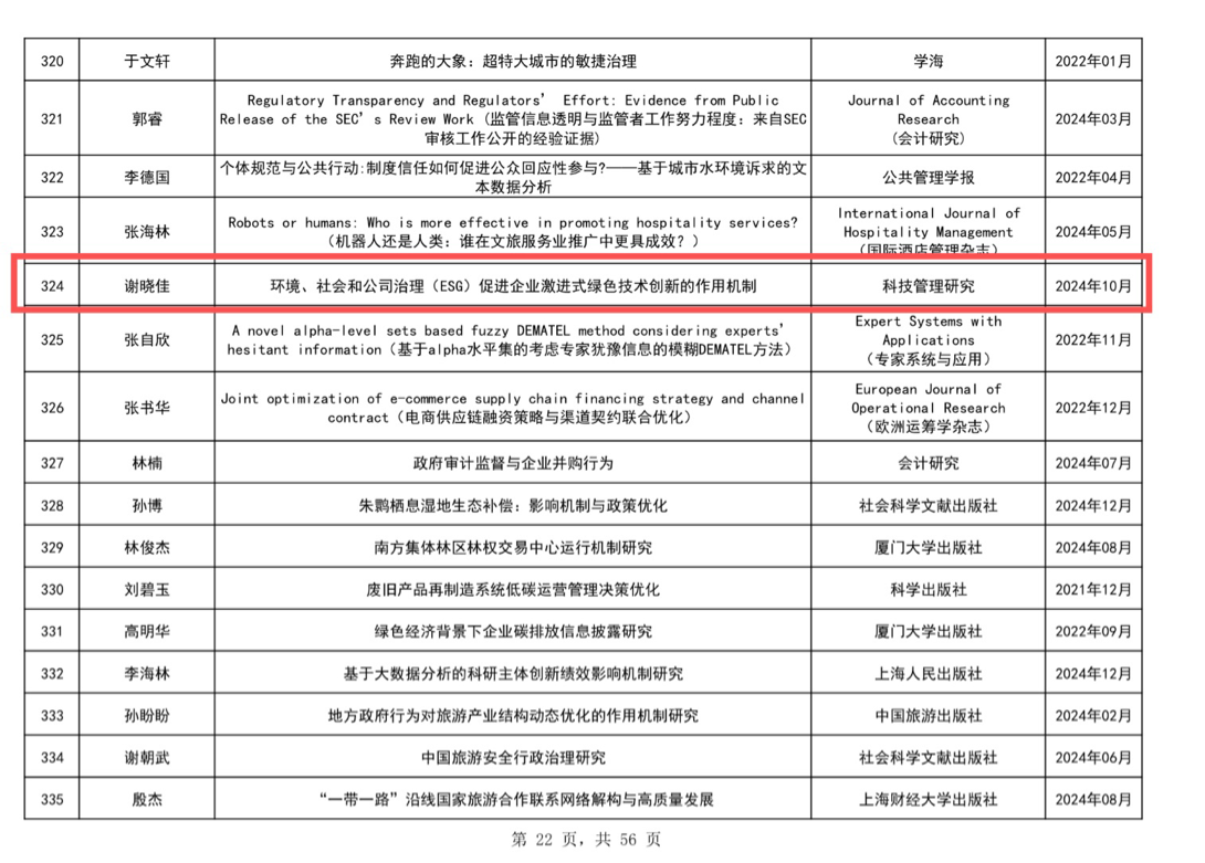 近日,根据《福建省第十六届社会科学优秀成果奖评审实施细则》,pg娱乐官网谢晓佳老师凭借《环境、社会和公司治理(ESG)促进企业激进式绿色技术创新的作用机制》研究成果成功入围。该成果发表于《科技管理研究》2024年10月刊,聚焦ESG与企业绿色技术创新领域,为行业发展提供理论参考。