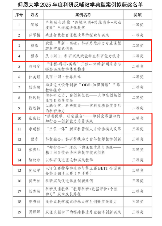 近日,pg娱乐电子游戏官网入口学术委员会公布2025年度科研反哺教学典型案例拟授奖名单,pg娱乐电子游戏官网入口4位教师上榜:程春副院长的《赋能·革新·突破:科研思维助力专业课程群教学模式创新》和《从0到1:科研实践赋能学生科研能力提升》2项案例荣获二等奖;张燕红老师的《“以赛促学,研创融合”——学科竞赛驱动的知行合一创新能力培养实践》和《“知行合一”理念下的课程改革与实践——基于闽台校企协同的教学模式创新》、李瑞松主任的《“三位一体”新商科营销人才培养模式改革》、程春副院长的《科教融合:科研帮扶助力青年教师教学创新》、姚秋珍老师的《以科研促进理论和实践教学》案例分别荣获三等奖。