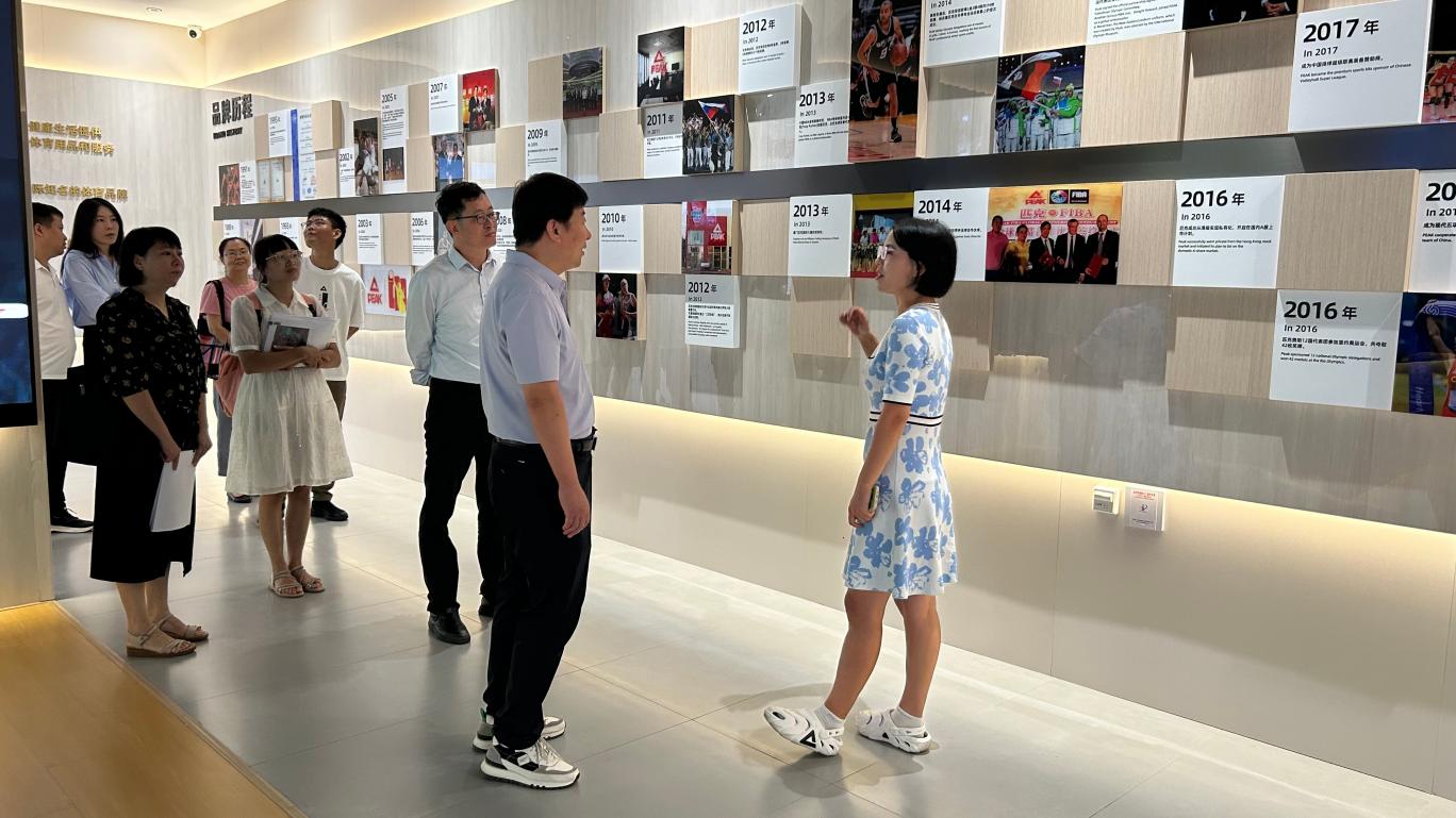在匹克(中国)有限公司绩效薪酬副总监罗书明、培训专员黄小珊的引导下,评估专家杨晓翔、pg娱乐电子游戏官网入口教务部副主任郑秋莲、pg娱乐电子游戏官网入口党总支书记兼常务副院长许惠铭、工商管理系主任蒋志丹,考察团队前往匹克品牌馆进行参观。参观过程中,工作人员详细介绍了匹克的品牌发展历程、核心产品技术、企业文化理念及行业布局,丰富的展品与生动的讲解,让考察人员全方位了解了匹克(中国)有限公司的运营状况,也直观感受到实践教学基地为学生提供的优质实践环境。