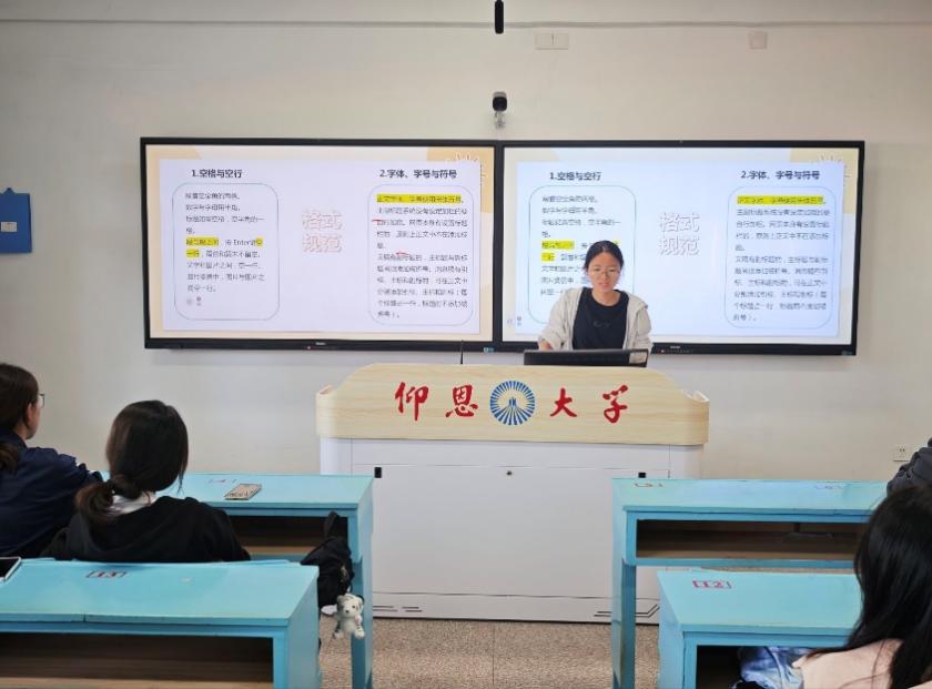 宣传部部长赖灿芸从新闻稿的格式规范和内容规范两个方面讲解新闻稿如何撰写,她通过实例分析,格式上强调标题、正文结构要点,内容上通过实例强调新闻的真实、客观、及时,还提醒注意语言表达,帮助干事们掌握新闻稿写作技巧。